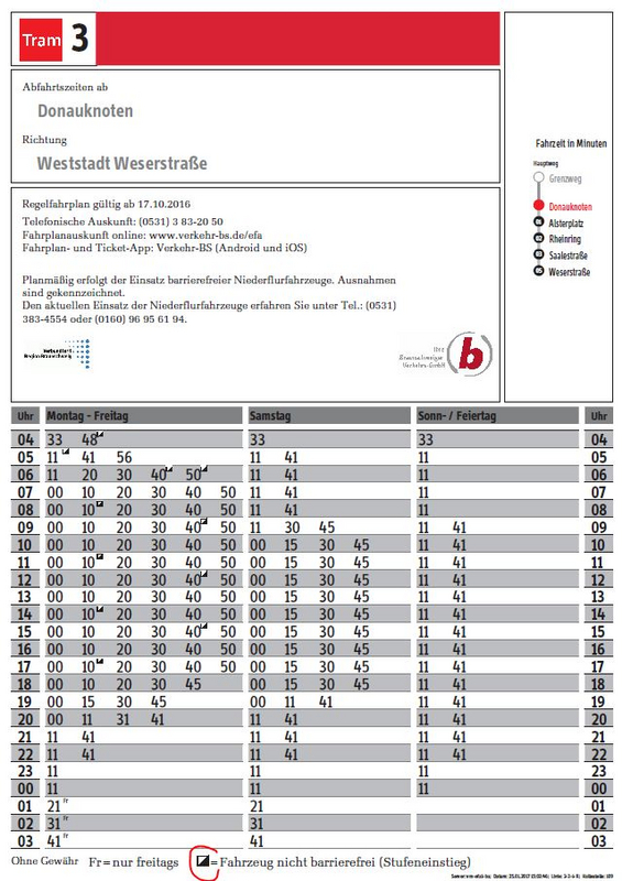 Seit dem Fahrplanwechsel im Januar 2016 sind im Aushangfahrplan an den Haltestellen die Fahrten mit niederflurgerechten Straßenbahnen nicht mehr extra ausgewiesen.